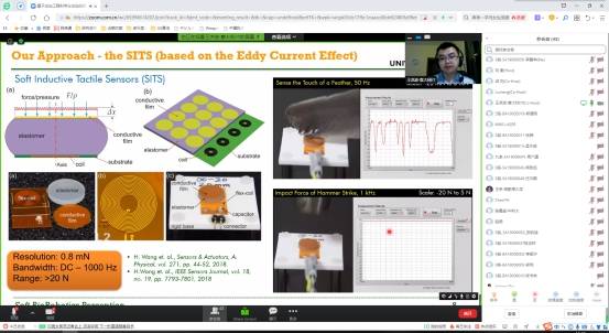 王洪波博士给与会师生带来了一场精彩的学术报告。王洪波博士指出柔性传感器在可穿戴传感与柔性机器人领域的应用前景。尽管软体机器人在实际工作生产中具有更好的柔韧性和安全性,然而依然容易受到负载和其他外界因素的影响,需要传感功能作感知。他们采用了基于涡流效应的柔性触觉传感器,通过将柔性驱动器与线圈电感相结合,实现无线柔性传感,并通过有限元分析仿真确保传感器具有很高的稳定性与可重复性。他还强调通过在柔性驱动材料中添加铁磁性物质的研究前景,利用其性质实现正反弯曲,可以扩大测量范围、提高灵敏度。在自由讨论环节,与会师生积极提问交流,反响热烈。