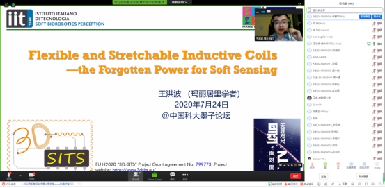 7月24日上午10点25分,意大利理工开元(中国)王洪波博士后在Zoom会议室受邀做学术报告,题目为“Flexible and Stretchable Inductive Coils: the Forgotten Power for Soft Sensing”,四十余位师生云端相聚此次报告。报告会由精密机械与精密仪器系执行主任刘诚教授主持。