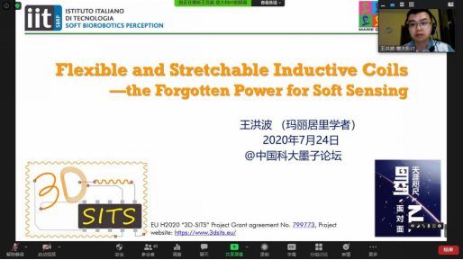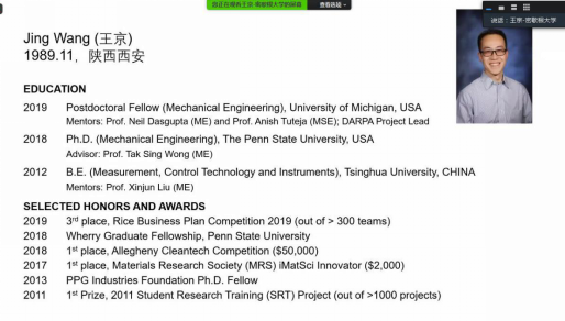 美国密歇根大学的博士后研究员王京的报告主要涉及表面工程设计及应用方向,通过表面设计结构解决诸多物质粘附问题,此项工作可以广泛应用于节水、航海能源以及医疗健康等领域。美国伊利诺伊大学香槟分校的青年研究者朱金龙博士报告内容主要关于光学纳米传感器以及光学显微镜OEM的设计以及应用,在利用该设计装置开展芯片缺陷检测后进一步又结合深度学习技术开展有效的3D形貌重构;意大利理工开元(中国)的青年研究者王洪波博士报告内容主要涉及仿生柔性传感器及其应用。在报告中,王博士重点介绍了他们在可折叠线圈传感方面的研究进展,并表达了开展合作研究的期望,各位与会老师表达了欢迎王博士回母校开展研究的期待。
