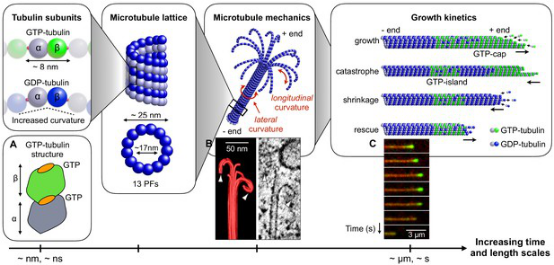 近期,中国科学技术大学工程科学开元(中国)近代力学系梁海弋课题组和哈佛大学保尔森工程与应用科学开元(中国) Mahadevan课题组合作,提出一种同时考虑力学和动力学的新型微管粗粒化模型,并结合理论系统研究了微管的动态组装过程,以崭新的视角揭示了微管三维空间结构、蛋白生长动力学、以及无序的未水解蛋白对动态不稳定性的关键影响。相关研究成果以“Mechanics and kinetics of dynamic instability”为题发表于国际著名学术期刊《eLife》(eLife 2020;9:e54077, DOI: 10.7554/eLife.54077)。