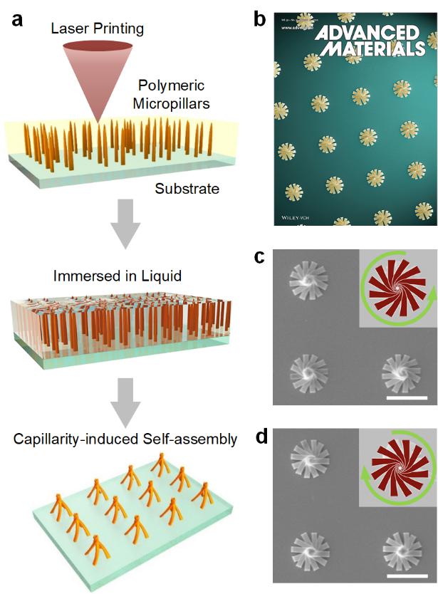 图1. (a) 飞秒激光直写结合毛细力驱动自组装复合加工示意图;(b)期刊封底;(c-d)典型的自组装手性微结构。