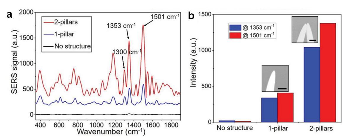图2. (a) 不同的结构的表面拉曼增强光谱;(b)结构类型对SERS光谱的影响关系。