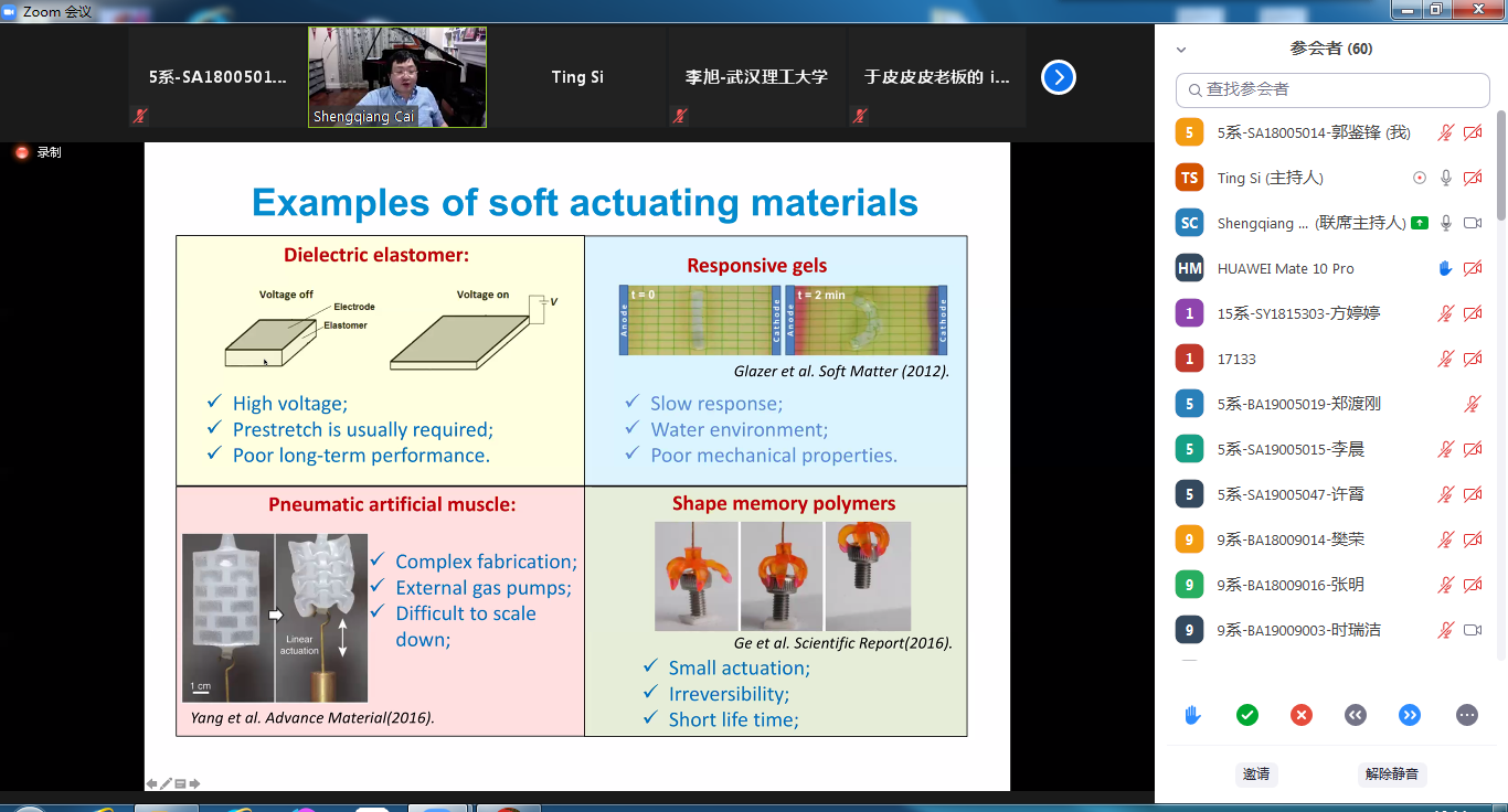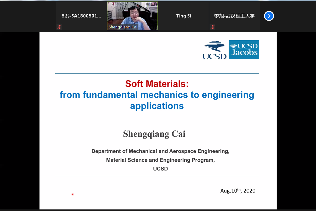 8月10日下午13点,加州大学圣地亚哥分校蔡盛强教授在ZOOM会议室受邀做学术报告,题目为“Soft Materials:from fundamental mechanics to engineering applications”,包括中国科大在内的国内多所高校师生云端相聚此次报告。报告会由工程科学开元(中国)司廷教授主持。