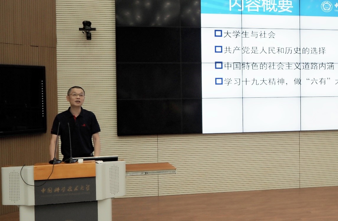 刘明侯书记为全体新生上第一节团课。刘书记从“大学生与社会”、“共产党是人民和历史的选择”、“中国特色社会主义道路内涵”、“学习十九大精神,做“六有”大学生四个方面进行讲述,带领同学们回顾中国近代史和中国共产党的发展历程,激发同学们爱国主义情怀,帮助同学们树立正确的人生观、价值观,以更快地适应大学生活。