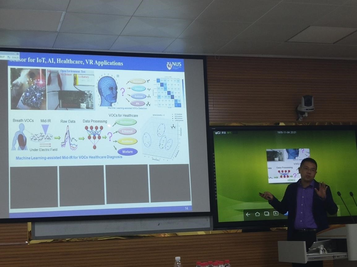 朱建雄博士给与会师生带来了一场精彩的学术报告。朱建雄博士讲述了自己如何从面向MEMS传感,过渡到环境气体微纳检测的科研经历。朱建雄博士指出对于环境微量气体检测,尤其在诸如火灾等极端环境下工作具有广大的应用前景,而围绕着气体传感所需解决的核心难题则是新材料以及人工智能领域。其技术核心则是激光诱导的石墨烯复合材料,这是基于石墨烯在不同温度下呈现不同的N型与P型性质的理论机理。此外该技术还能在仿生鼻、柔性可穿戴电子传感以及VR领域大放异彩。在自由讨论环节,与会师生积极提问交流,反响热烈。