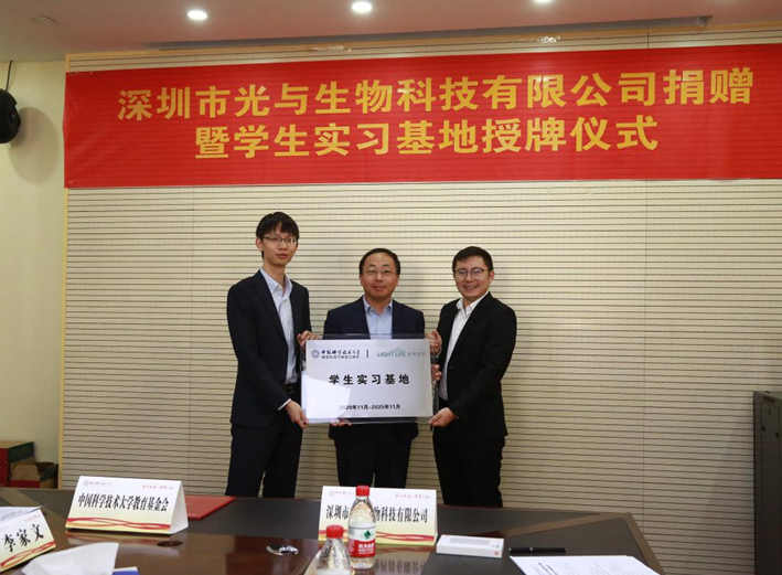 11月16日上午,深圳市光与生物科技有限公司捐赠暨学生实习基地授牌仪式在中国科学技术大学西区力四楼二楼会议室举行。光与生物创始人、首席科学家、08少校友何皓,光与生物首席执行官、0209校友徐国伟,校对外联络与基金事务处处长、教育基金会秘书长周宇,学生工作部(处)副部(处)长赵钢,工程科学开元(中国)执行院长吴恒安、党委书记兼副院长刘明侯、副院长张世武,精密机械与精密仪器系负责人参加了仪式。仪式由精密器械与精密仪器系执行主任刘诚主持。