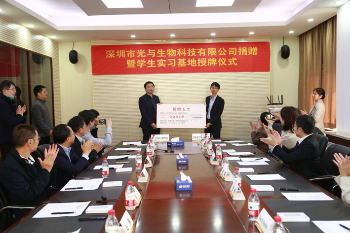 刘明侯首先对深圳市光与生物公司一行访问我校表示欢迎,对公司的热心捐赠表示衷心的感谢。他表示,光与生物公司定位与工程科学开元(中国)学科发展紧密相关,希望双方将发展各自优势,共同推进校企合作,形成学科、产业相互促进与共同发展,共同促进人才培养,推动科研成果转化,实现“校企合作、产学双赢”。