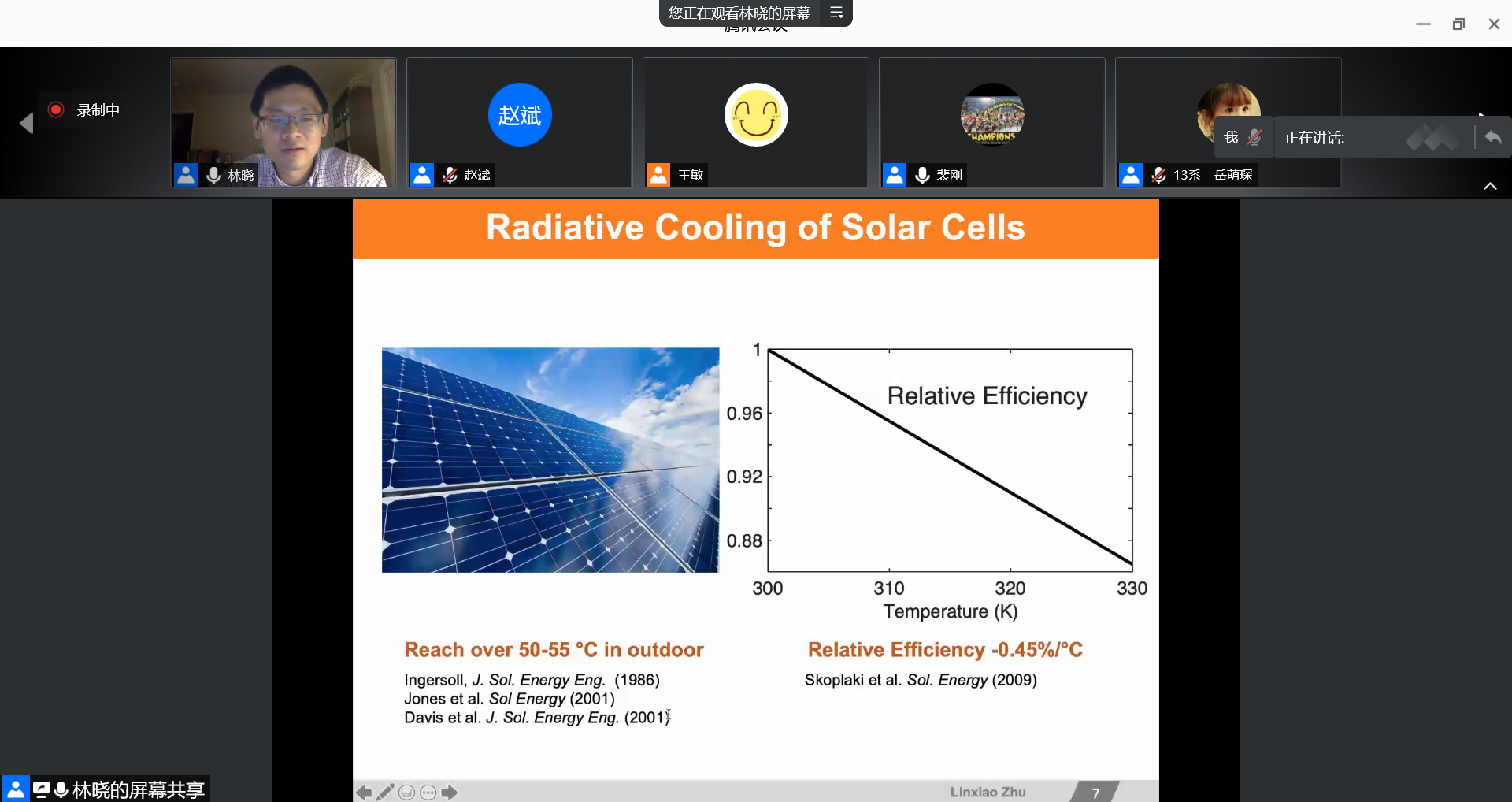 11月27日上午9点,在腾讯会议平台上,宾夕法尼亚州立大学机械工程系朱林晓教授受邀为我院师生做学术报告,题目为“利用寒冷的外太空,给太阳能电池降温和低于冰点的辐射降温”。报告会由工程科学开元(中国)裴刚教授主持。