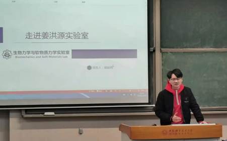 生物力学与软物质力学实验室由姜洪源教授创立,研究传统力学与生物医学交叉领域问题,具体有组织细胞的力学建模配合细胞的粘附,铺展运动以及体积调控;细胞周围力学微环境对细胞周期,干细胞分化的调控机制和应用;细菌浴等活性系统中主动颗粒与被动颗粒的相互作用以及运动模态;凝胶等材料薄膜界面接触失稳的研究,材料3D打印的缺陷设计和软体机器人设计。除实验室的简介外,杨皓翔学长作为13级近代力学系本科生,也与同学们分享了关于本科学习生活的一些见解和看法,通过自身学习科研经历,解答了在场同学关于科研和学习之间权衡的疑惑。