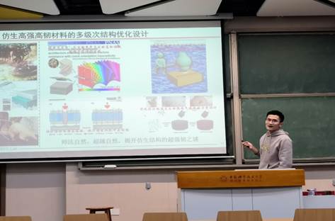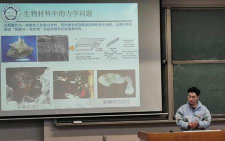 随后,由近代力学系博士生吴开金学长为大家介绍由倪勇教授、何陵辉教授指导的材料演化与断裂控制实验室。课题组长期从事固体力学和仿生微结构力学等领域的研究。主持多项国家自然科学基金、中科院战略先导B 专项子课题、华为公司委托项目等,参与包括科技部重大基础研究计划和国家自然科学基金重点项目,取得了多项重要成果。吴学长心怀梦想,励志科研,成果丰硕。面对同学们关于本科生科研能力的疑惑,吴学长满怀科研激情地鼓励大家:大胆进入实验室,尽早开始科学探索,用高水平科研成果来选择未来的生活。