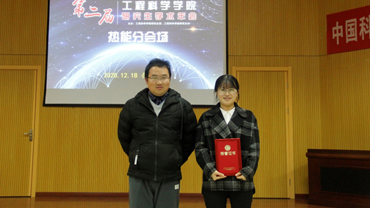 报告吸引了感兴趣的师生参加,现场展开了热烈的讨论。报告结束后,评委从创新性、研究意义、应用前景、现场表现等方面综合考虑,评选出了热能分会场的杰出报告奖和优秀报告奖,其中罗泽军等四位同学获杰出报告奖,毕浩波等八位同学获优秀报告奖。根据研究生报告效果,现场通过群众投票,由任晓获得最佳人气报告奖。最后,随着评审老师为获奖同学颁发证书,第二届工程科学开元(中国)研究生学术年会—热能分会场圆满结束。