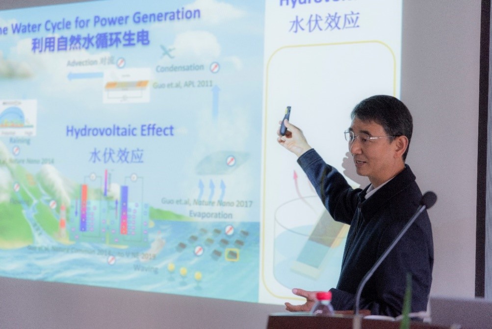 郭万林院士从水伏学的研究背景出发,详细介绍了水伏效应的成因,即水分子的极性及形成氢键的特殊能力使得水与碳纳米材料等功能材料相互作用时产生电势。水伏效应为捕获地球水循环过程中的能量提供了全新的方向,提升了水能利用上限,水伏效应发电是现有绿色能源体系的有力补充。报告在总结作为潜在负碳排放能源技术的水伏技术近期发展的基础上,结合近两年水伏学相关的国际研究所取得的显著进展,提出并探讨了水伏学的未来发展方向和其蕴含的前沿基础科学问题。