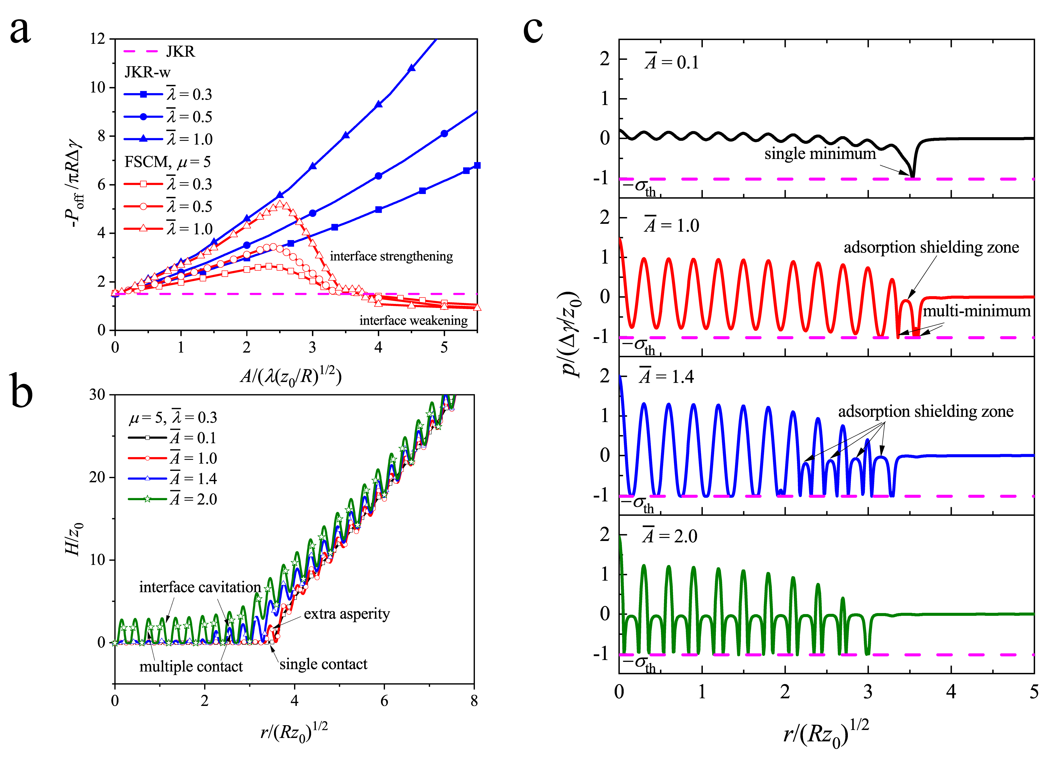 针对上述问题,研究团队通过建立粗糙表面变形与相互作用的自洽方程,发展了完全自洽模型(FSCM)。该模型是连续介质力学框架内最为准确的吸附接触力学模型,然而自洽方程中含有强非线性积分项,需要通过数值迭代求解。为此,研究人员在一个新的计算程序中,利用椭圆积分的性质,结合Riemann–Stieltjes积分从根本上解决了吸附自洽方程中积分项所存在的奇异性问题,并采用弧长控制法、自适应网格和牛顿迭代法等技术解决了数值求解的困难,获得了高精度的数值计算结果。在较小的表面粗糙度下,完整载荷–位移曲线呈现单重振荡特征,这与Guduru基于JKR理论获得的认识一致。而在较大的表面粗糙度下,完整载荷–位移曲线呈现双重振荡或局部回旋振荡特征(图1c),区别于JKR理论预测的单重振荡特征。研究人员发现,随着粗糙度的增加,界面强度先增大后减小(图2a),吸附模式从简单接触转变为多点接触(图2b)。进而,研究人员建立了吸附模式分区图,给出了界面增强/减弱的临界粗糙度,并揭示了吸附增强/减弱的力学机理(图2c)。当表面粗糙度较小时,在拔出过程中接触区内出现起伏状压强分布,使得拔出力增大;而当表面粗糙度较大时,由于粘着应力存在上限,在拔出过程中局部界面出现空化,形成吸附屏蔽区,使得拔出力减小。这些认识表明在后续发展粗糙表面吸附接触的简化模型时,必须放弃紧密接触条件,并约束粘着应力的最大取值。