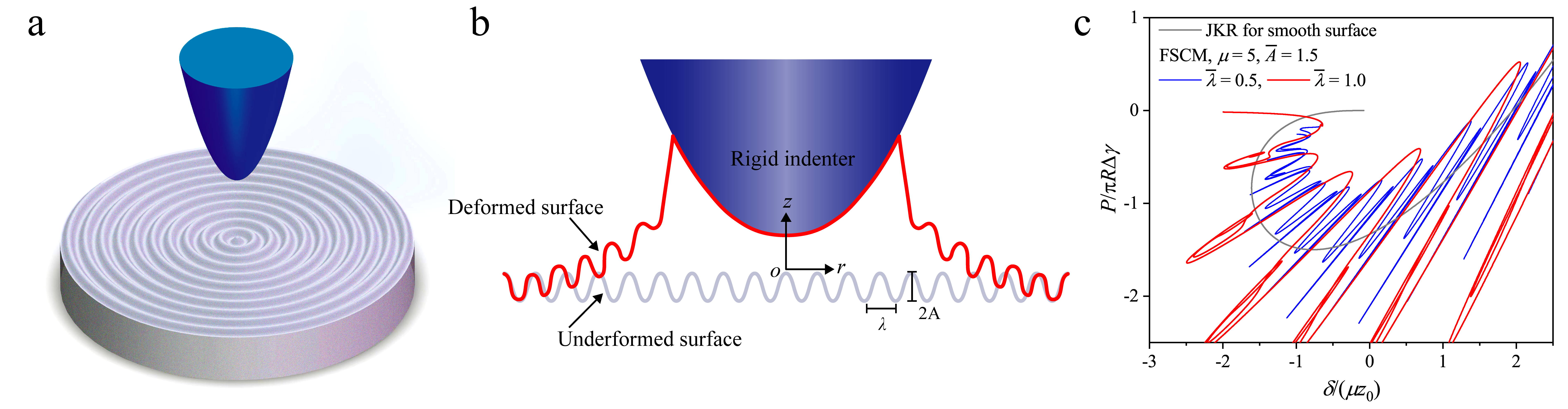 自然界中许多现象与粗糙表面吸附接触问题密切相关,如昆虫吸附在物体表面、壁虎在墙壁上行走、细胞吸附探针或其它细胞、噬菌体侵染大肠杆菌。理想光滑表面并不存在,实际表面都是粗糙的,表面粗糙度对材料吸附行为的影响存在着持久性争议,力学机理尚不明晰。2007年,美国布朗大学Guduru教授及其合作者将经典的JKR理论推广用于研究波浪形粗糙表面的吸附接触问题(后来被称为Guduru问题,图1),认为表面粗糙度使材料界面得到增强,并指出其机理为表面粗糙度引起了载荷-位移曲线的振荡,增大了分离界面所需要的拔出力。然而,Guduru的结果导致拔出力与粗糙度正相关的悖论,无法解释那些表面粗糙度减弱吸附的实验现象。