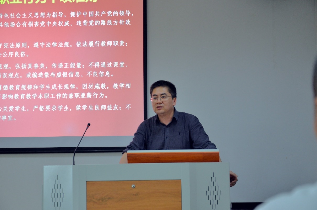 胡芃首先带领全体教工学习了《新时代高校教师职业行为十项准则》、《教育部关于高校教师师德失范行为处理的指导意见》、《关于进一步弘扬科学家精神加强作风和学风建设的意见》等文件精神,传达了院党委成立师德师风建设工作小组的通知,要求全体教工把潜心立德树人和执着攻关创新结合起来,积极推进师德师风建设。