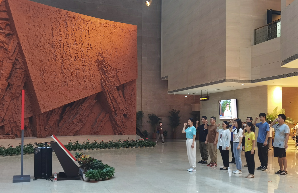 进入纪念馆内部,支部全体党员在《胜利之师》大型雕塑前面向党旗重温入党誓词,激励自己不忘初心、牢记使命、永远奋斗。铿锵的誓词,让党员们仿佛重回当初加入党组织的那一刻,更加坚定了自己的理想信念和党性认识。