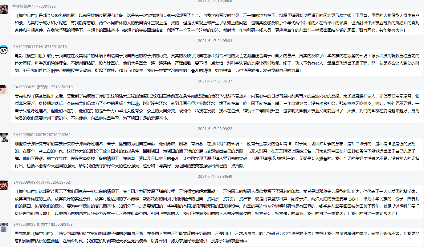 我校是为“两弹一星”事业而创办的一所红色大学,在科大工作过的科学家中,就有钱学森、郭永怀、赵九章、周光召等11位“两弹一星”功勋奖章获得者,他们都为国家研制“两弹一星”和培养尖端科技人才做出了卓越贡献。因此,大家观看完影片后感触更加深刻,纷纷赞叹革命前辈们、老一辈科学家们艰苦奋斗、绝不屈服的精神。