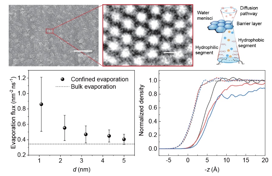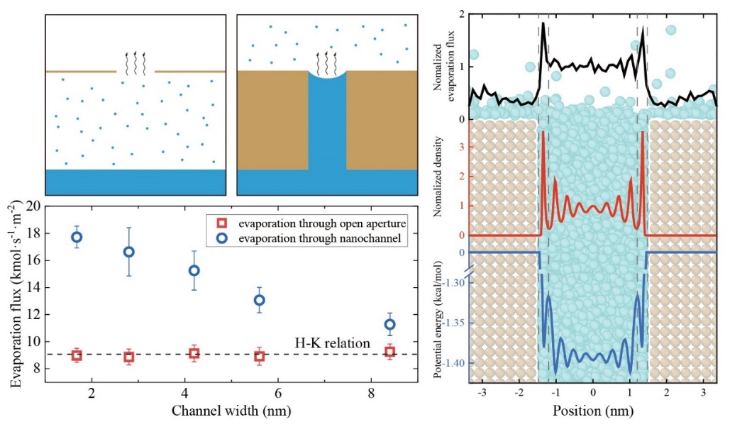 限域传质主要研究受限在纳米通道中的水、离子、气体等介质输运的动力学行为。限域传质的相关研究在能源、环境、健康等领域具有重要应用背景,近年来得到了科学界、工程界和工业界的广泛关注。纳米尺度下,界面效应占主导,受限液体具有不同于宏观尺度的结构和输运特性,传统的连续介质力学模型不再适用,学术界目前仍缺乏统一的认识和普遍认可的理论模型。我校计算力学实验室长期致力于探究限域传质的微观力学机理。该团队在分子尺度分析了纳米通道中的蒸发增强现象,从自由能角度解释了界面层蒸发速率高的原因,并建立了蒸发驱动纳通道液体流动的力学模型,研究成果以“Evaporation-driven liquid flow through nanochannels”为题发表在流体力学领域国际权威期刊Physics of Fluids上。