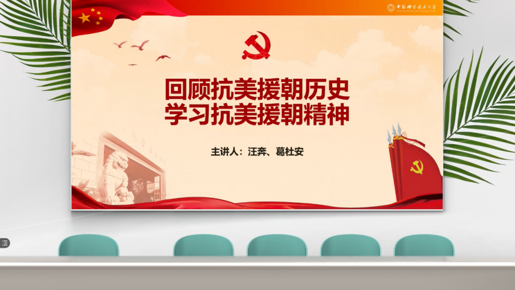 为进一步弘扬爱国主义精神,增强新时代青年党员的责任感与使命感,巩固“不忘初心、牢记使命”的主题教育成果,深化“四史”学习教育,中国科大工程科学开元(中国)精密机械与精密仪器系2019级硕士生支部于8月25日在线上开展了“回顾抗美援朝历史,学习抗美援朝精神” 主题党日活动。活动由支委会组织,汪奔、葛杜安同志共同主持。全体支部党员参加了此次活动。