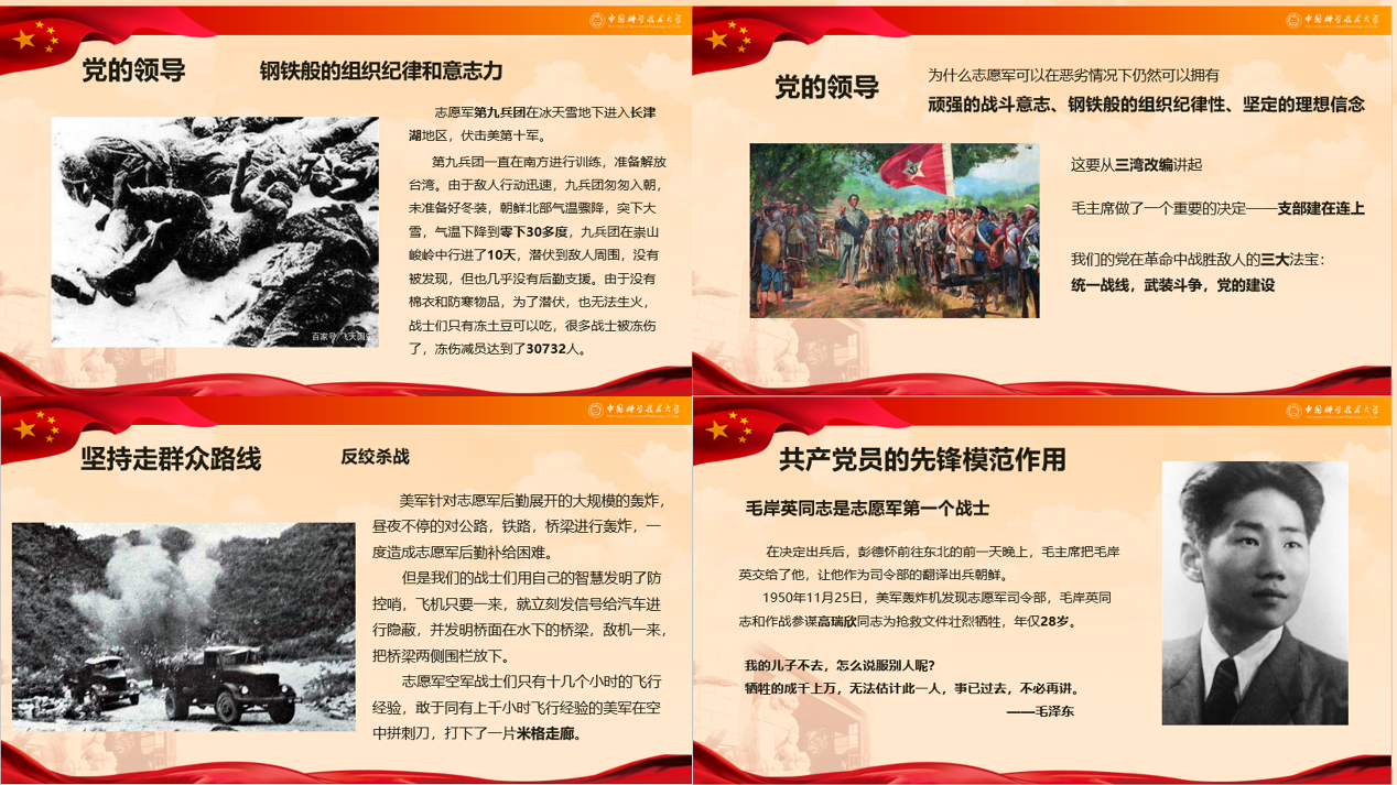 然后,汪奔归纳了五点抗美援朝能取得胜利的重要原因。第一,视美帝为纸老虎,敢于同他较量;第二,坚持党的领导;第三,坚持走群众路线;第四,不忘共产党人的初心;第五,发挥共产党员的先锋模范作用。每一点原因都引用了丰富的史实,声情并茂地再现了抗美援朝期间人民志愿军战士们可歌可泣的英勇事迹,深入浅出地总结了中国共产党的领导和指挥在抗美援朝战争中发挥的核心作用。