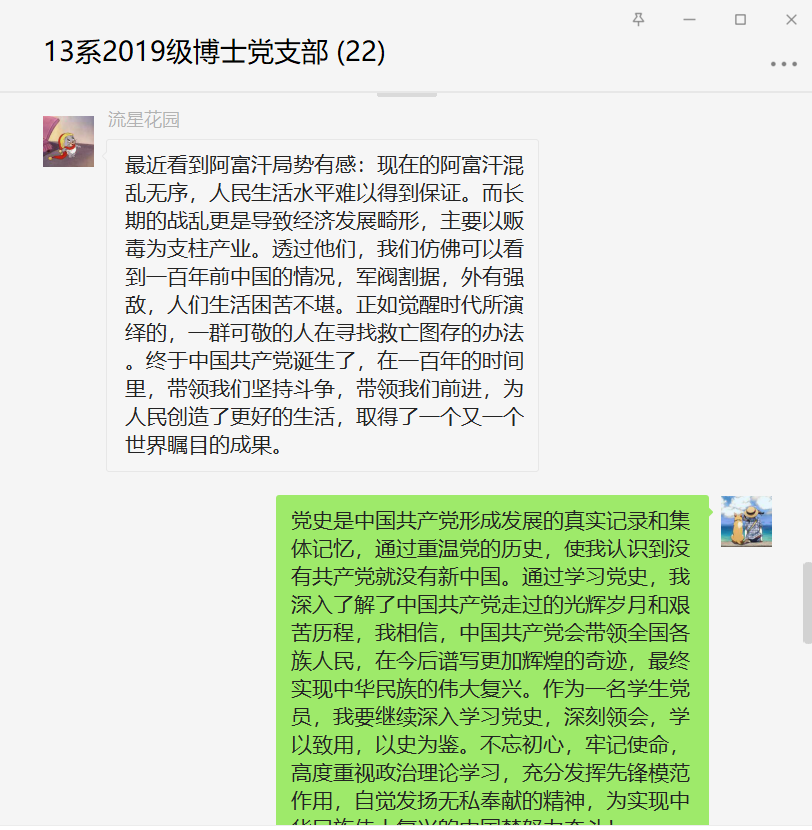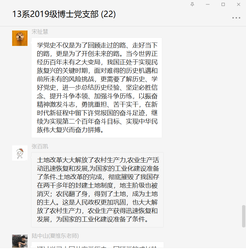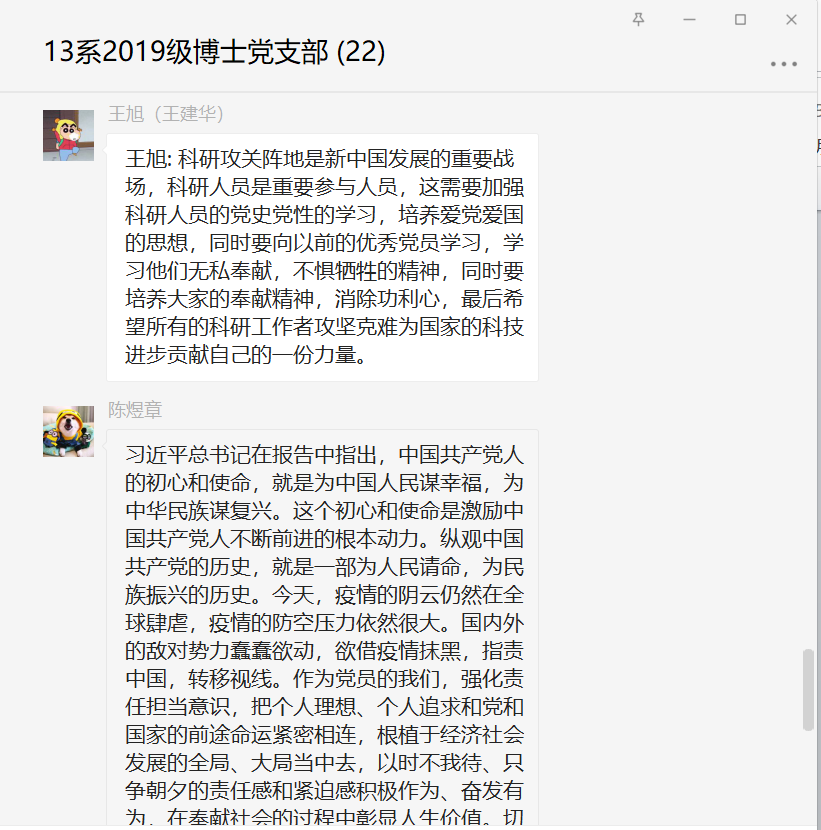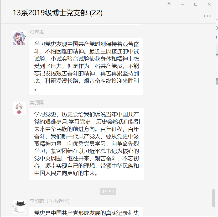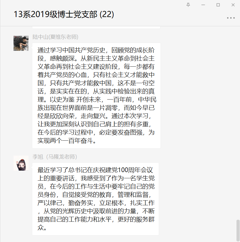 随后,各位党员同志结合学习内容与自身情况逐次发言,进行批评与自我批评,大家普遍认识到继续深入学习党史,深刻领会,才能学以致用。以史为鉴,同志们纷纷表示,在以后工作过程中,不忘初心,牢记使命,高度重视政治理论学习,充分发挥先锋模范作用,自觉发扬无私奉献的精神,为实现中华民族伟大复兴的中国梦努力奋斗。大家各抒己见,氛围严肃而轻松,并将相关发言形成文字分享在微信群。