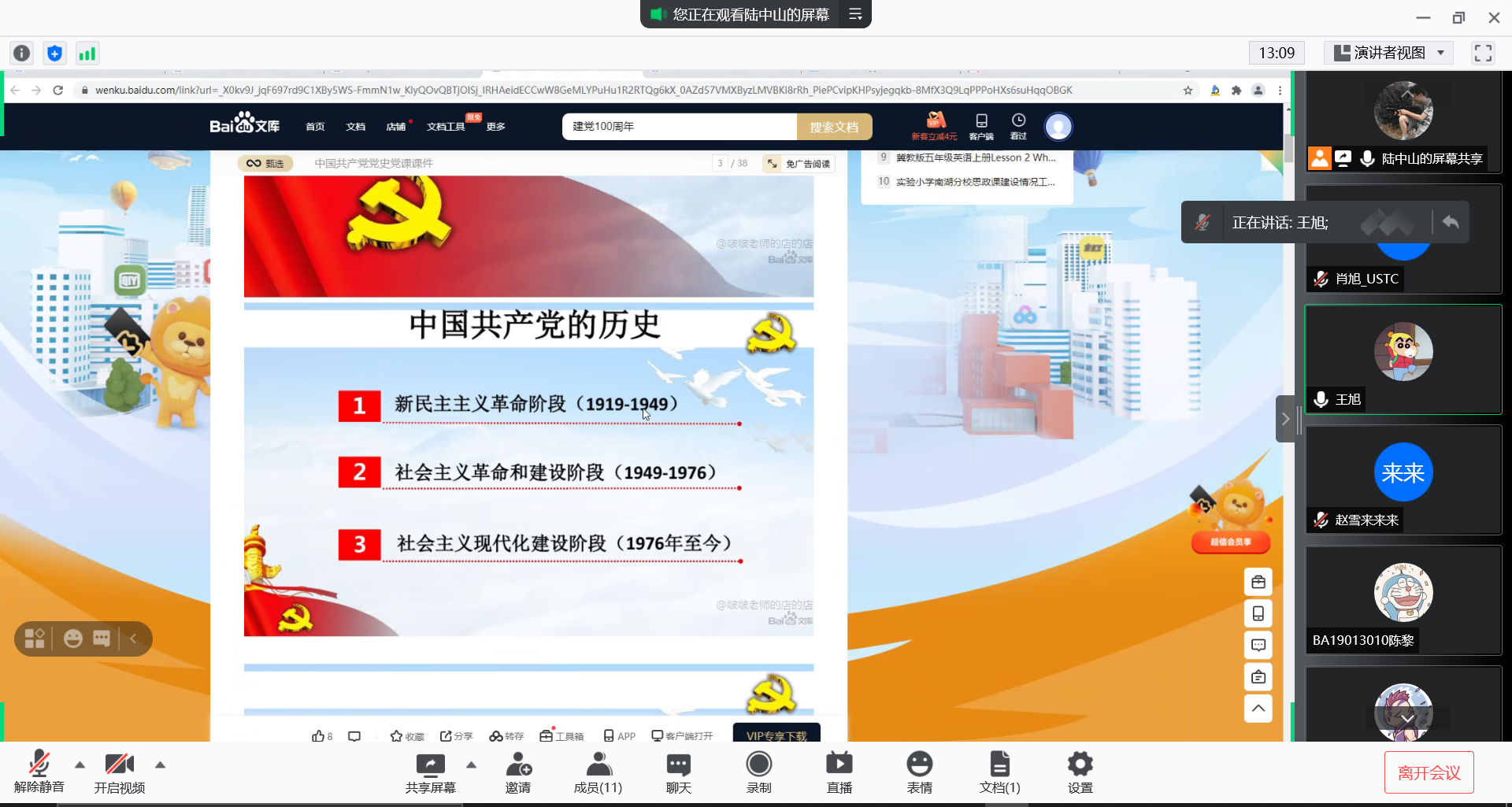 会上,陆中山同志带领大家学习了校党委关于召开党史学习教育专题组织生活会的文件通知精神,汇报了支部党史学习和习近平总书记在庆祝中国共产党成立100周年大会上的重要讲话精神的学习情况。共同回顾了从新民主主义革命阶段到社会主义现代化建设阶段中我党经历的重要历史事件。