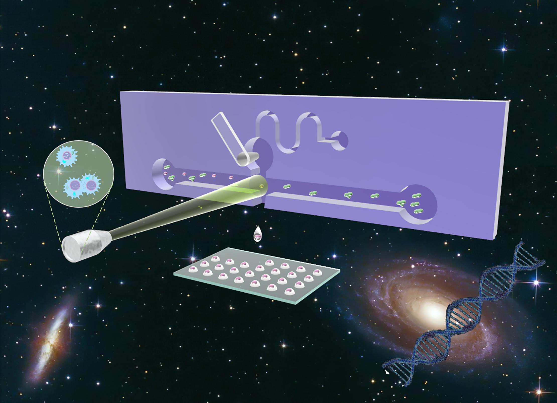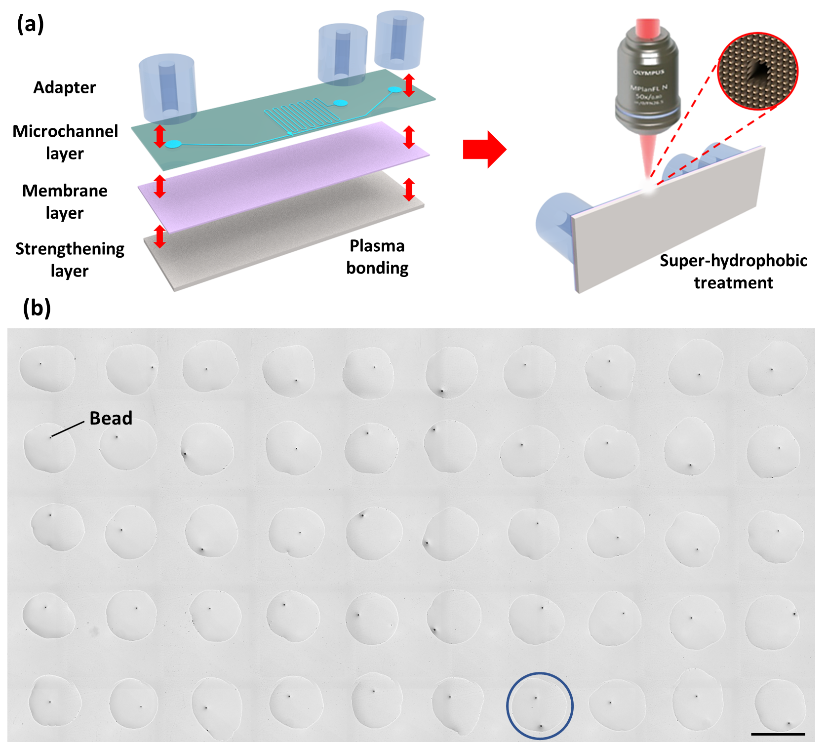 图二 (a)微流控芯片的制作与设计 (b)单粒子液滴阵列。