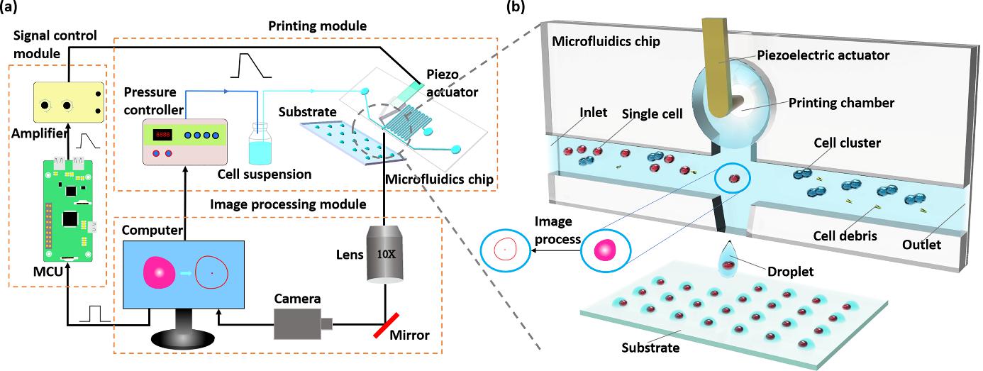 为了研究单个细胞之间生物大分子的差异,研究人员需要把单个细胞分离分析。然而,目前的单细胞分离技术存在依赖荧光标记和低性能的问题。本文开发了一种新的单细胞分离技术,使用微流控冲击打印与细胞二维图像实时识别技术,将单细胞封装在单个液滴中。如图一所示,单细胞分离系统由信号控制模块、图像处理模块、打印模块三个模块组成。细胞悬浮液通过在压力泵的推动下从微流控通道入口流动到出口。高速相机实时捕捉采集检测区域的图像,利用计算机对图像进行实时处理,以识别单个细胞,然后向信号控制模块发送触发信号,触发压电致动器撞击打印室上的柔性薄膜,从喷嘴处产生一个包含单个细胞的液滴,并结合位移台运动形成单细胞液滴阵列。