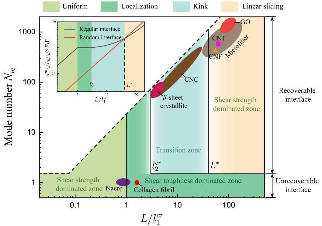 (4)使用一些通用的特性参数,提出了层状纳米复合材料的变形模式相图,给出了不同非共价界面层级材料的设计图景,为砖块-界面型复合材料的力学设计和优化提供理论指导。