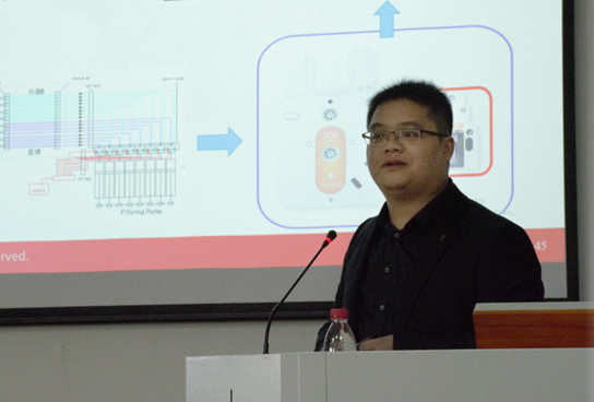 吴平高级工程师给与会师生带来了一场精彩的学术报告。报告首先介绍了测序技术的历史发展以及在无创产筛、肿瘤基因检测等前沿技术领域的应用情况。基因测序仪,为生物医学研究提供全基因组序列鉴定的关键设备,特别是在新冠疫情期间,提供了新冠病毒的变异位点、病原宏基因组信息,为病毒传播溯源等发挥了无法替代的作用。由于基因测序仪的技术壁垒极高,在全球范围内具备自主知识产权基因测序仪的厂家屈指可数,报告指出了关于突破长期被国外垄断局面的技术挑战。其次,报告还从原理、技术、结构、授权及应用市场等多个方面对真迈生物科技研发的国产测序仪SURF-Seq:GenoLab进行了详细介绍。在自由讨论环节,参会师生就流体设计,热设计,以及如何探测微弱荧光和仪器减震等问题与吴平高级工程师进行交流互动。