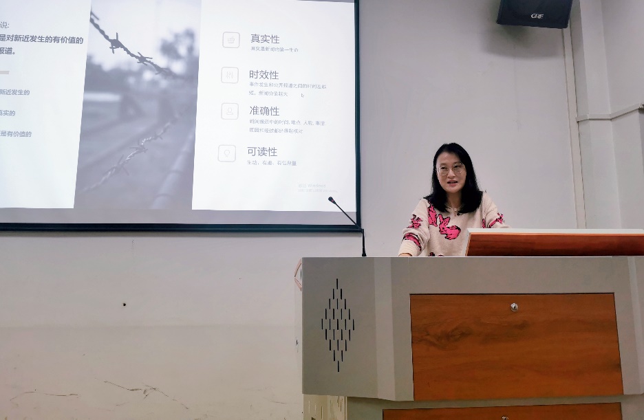 “新闻是启迪人们思想的最好的工具,它提高人们的素质,使之成为有理智、有道德的社会之人。”曾皓老师以托马斯·杰斐逊关于新闻的描述开场,简要介绍了在不同国家、不同的研究者对新闻的不同的定义,并明确指出,新闻就是对新近发生的有价值的事实的报道,强调了新闻的真实性、时效性、准确性和可读性。她从消息、通讯、特写、评论等新闻的分类,介绍了新闻的六要素,即何时,何地、何人、何事、何故、何果。