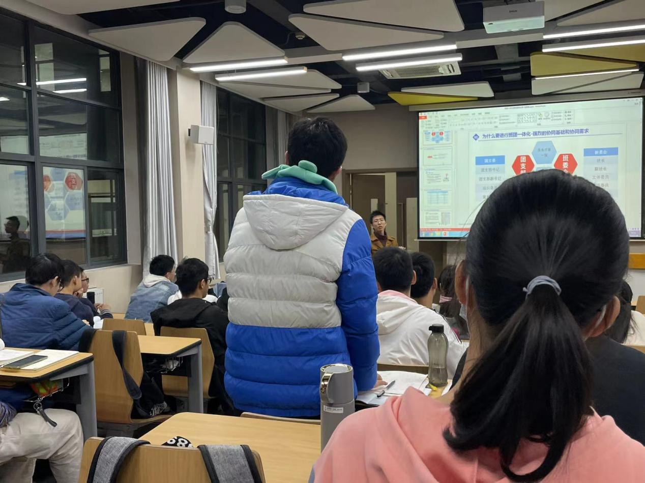 之后刘煜超学长进一步提出怎样做到班团一体化。“第一是制度保障,例如班长兼任团支部副书记、团支部书记兼任副班长,班委会、团支委共同讨论班级工作等;第二是工作模式,例如团日活动、班级活动采用项目化管理,日常工作明晰分工、压实责任。”刘煜超学长又以2021级本科新生班级内班团委成员举例,提出问题让现场同学回答,进一步提升了同学们的积极性,让同学们更多的了解到班团一体化的建设。