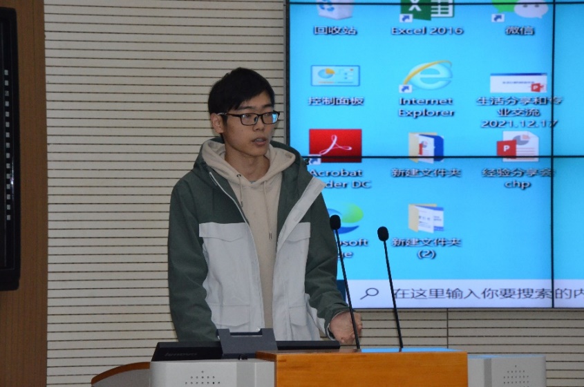 热科学和能源工程系2018级陈海鹏同学以时间顺序分享了自己大学生活的精彩瞬间,介绍了自己的学习心得。他认为学习上养成良好习惯极为必要,唯有认真听讲及时巩固,才能深入的理解课程内容。他还分享了自己的业余爱好——羽毛球运动与旅行生活,希望同学们合理安排时间,在学习和生活之间做好平衡。