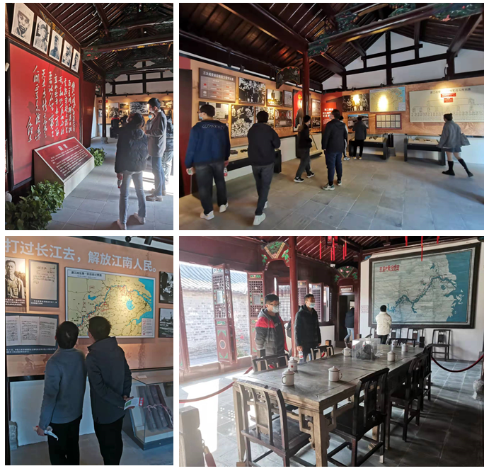 下午13时许,全体同志抵达位于肥东县瑶岗社区的渡江战役总前委旧址纪念馆,先后参观了参谋处旧址、《渡江颂》书画展厅、总前委旧址、机要处旧址和秘书处旧址。渡江战役总前委领导人卧室及会议室旧址布局完好,简单陈列着发报机、电话、煤油灯等革命文物。同志们深切体悟到昔日战争前线条件的艰苦以及人民战争必胜的决心和信心。参观中,党员同志不时结合自己所了解到的史料和展板展示的内容与其他同志开展交流和讨论,思维碰撞的同时让全体同志对渡江战役的重要历史意义也有了更深层次的思考和理解。