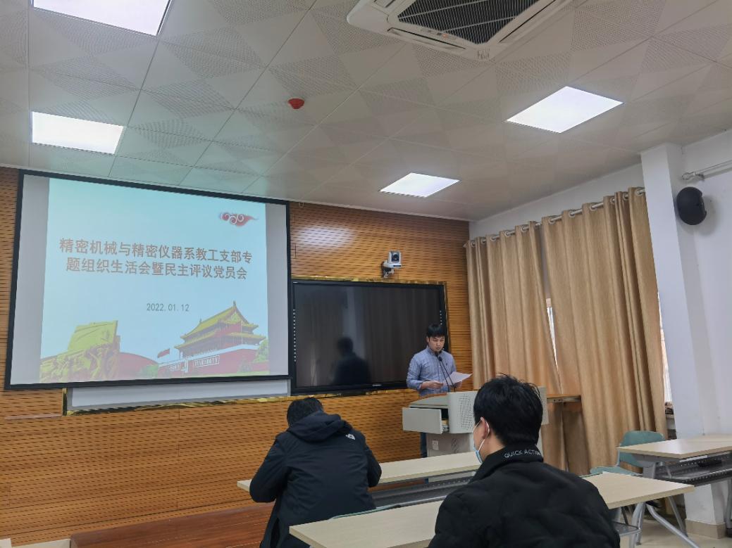 精密机械与精密仪器系教工支部于2022年1月12日在力二楼215多媒体会议室召开了2021年度教工支部专题组织生活会并进行民主评议党员工作会议,本次会议由支部书记叶回春老师主持,系党总支书记李家文老师及全体教工支部成员参加了会议。