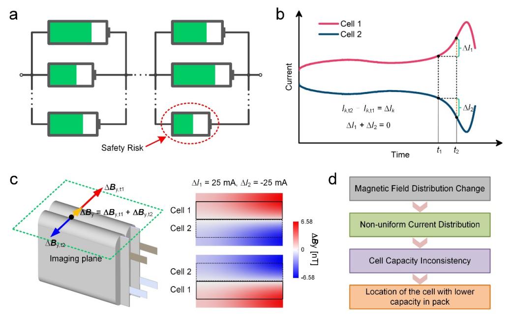 图3 基于磁场成像检测电池组容量一致性。(a)电池组容量不一致问题。(b)电池组内部非平衡电流。(c)磁场测量平面及磁场仿真结果。(d)检测方法原理图。