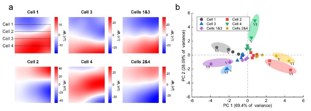 图4 使用磁场图检测电池组容量一致性。(a)电池组磁场图。(b)主成分分析结果。