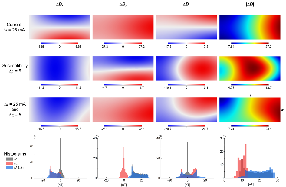 图2 电池电流和电极材料磁化率对感应磁场的影响