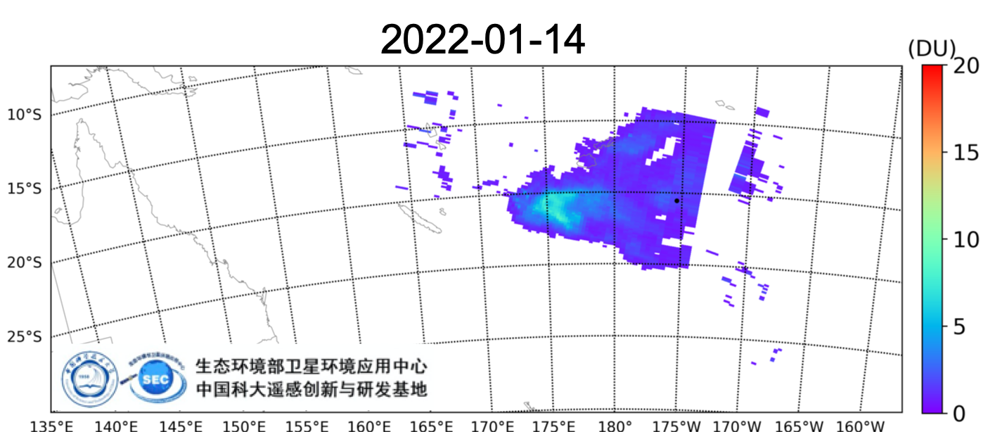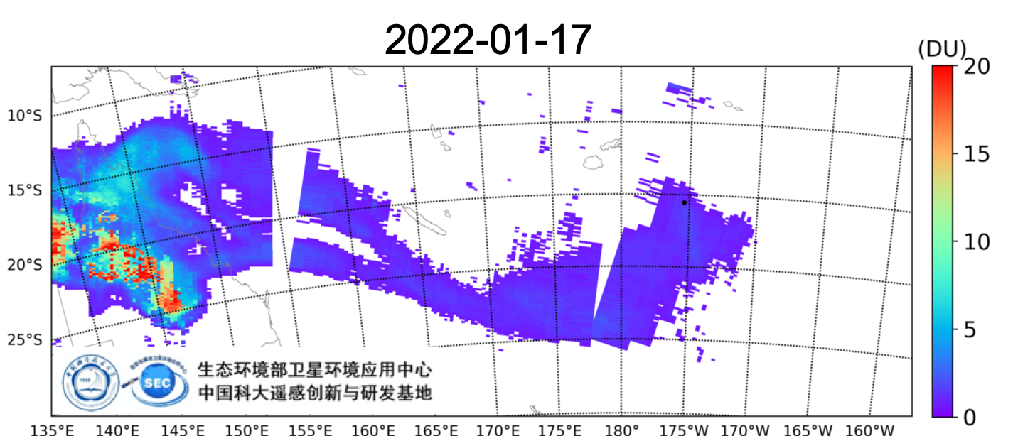 1月17日,汤加火山喷发的SO2羽流继续向西飘移(图7)。