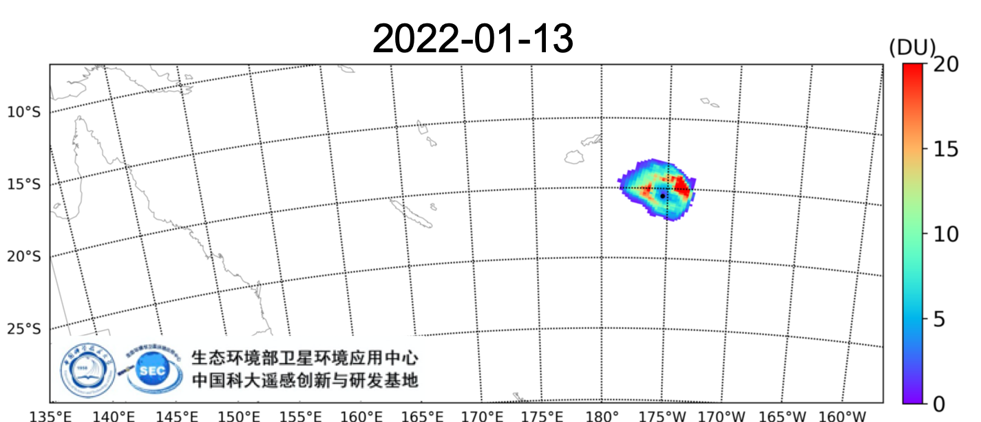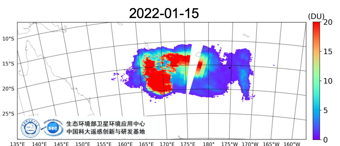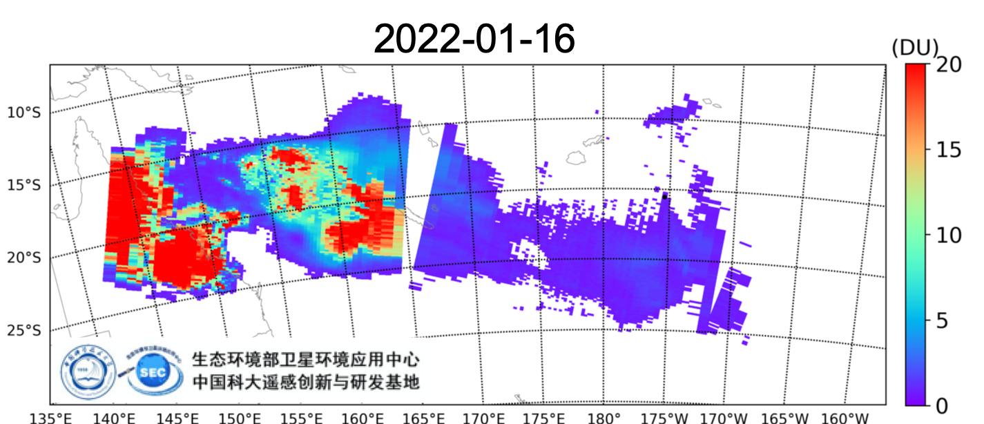 中国科学技术大学工程科学开元(中国)与生态环境部卫星环境应用中心共建的大气环境遥感创新与研发基地采用完全自主开发的大气污染物超光谱遥感算法,成功捕获2022年1月汤加火山喷发产生的大量二氧化硫(SO2)烟羽分布。