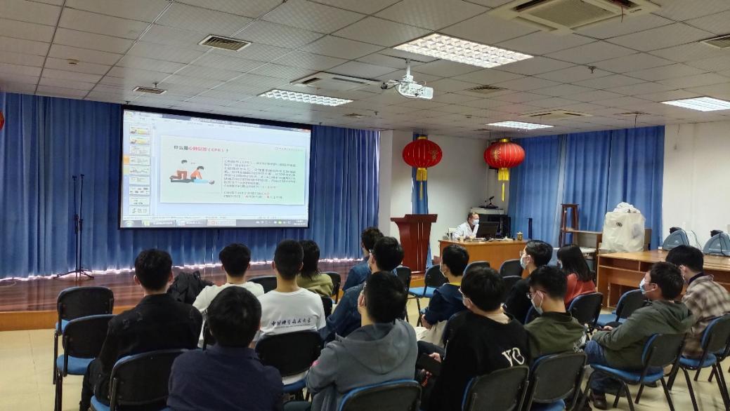 校医院医师首先为同学们讲解心脏骤停最佳抢救时间,分别从“如何识别心脏骤停”、“如何正确拨打急救电话和呼救求助”、“如何进行高质量的CPR和AED的配合使用”三个方面进行培训,结合教学视频补充讲解了急救的技巧以及诸多细节。