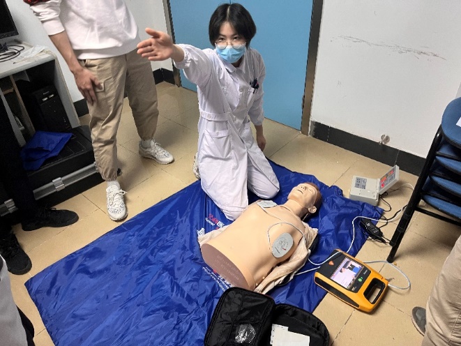 最后医师们将大家分成三组,每个组都分配了医用假人和AED除颤仪。三名医师分别现场教学演示,并让同学们上手操作。在实际练习过程中,医师对同学们的错误手法进行指正与示范,保证每个同学都真正掌握并能正确运用急救的相关知识。