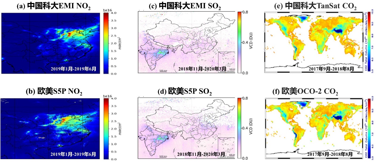 国产超光谱卫星痕量气体遥感结果(上图)与国际最先进同类卫星官方产品(下图)对比。(a)国产EMI载荷的NO2反演结果;(b)欧美S5P卫星的NO2反演结果;(c)国产EMI载荷的SO2反演结果;(d)欧美S5P卫星的NO2反演结果;(e)国产TanSat卫星的CO2反演结果;(f)欧美OCO-2卫星的CO2反演结果