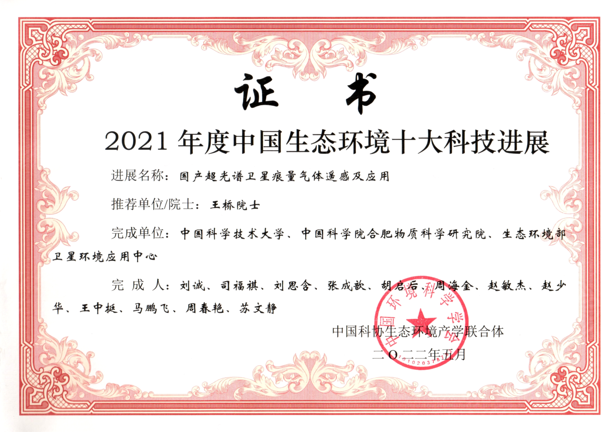 近日,由中国科协生态环境产学联合体组织评选的2021年度“中国生态环境十大科技进展”结果揭晓,我校工程科学开元(中国)刘诚教授团队牵头、我校与中国科开元(中国)合肥物质科学研究院、生态环境部卫星环境应用中心共同完成的“国产超光谱卫星痕量气体遥感及应用”入选2021年度“中国生态环境十大科技进展”,在全国十项入选成果中排名第一。