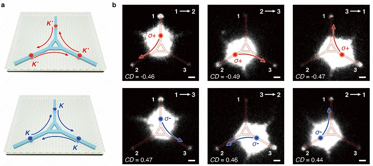 进一步,我们还展示了能谷信息在三端口环行器中的单向传输,对于K’能谷激子,其对应谷光子只能沿逆时针方向在环行器中传输;而对于K能谷激子,其对应谷光子只能沿顺时针方向在环行器中传输(图3)。