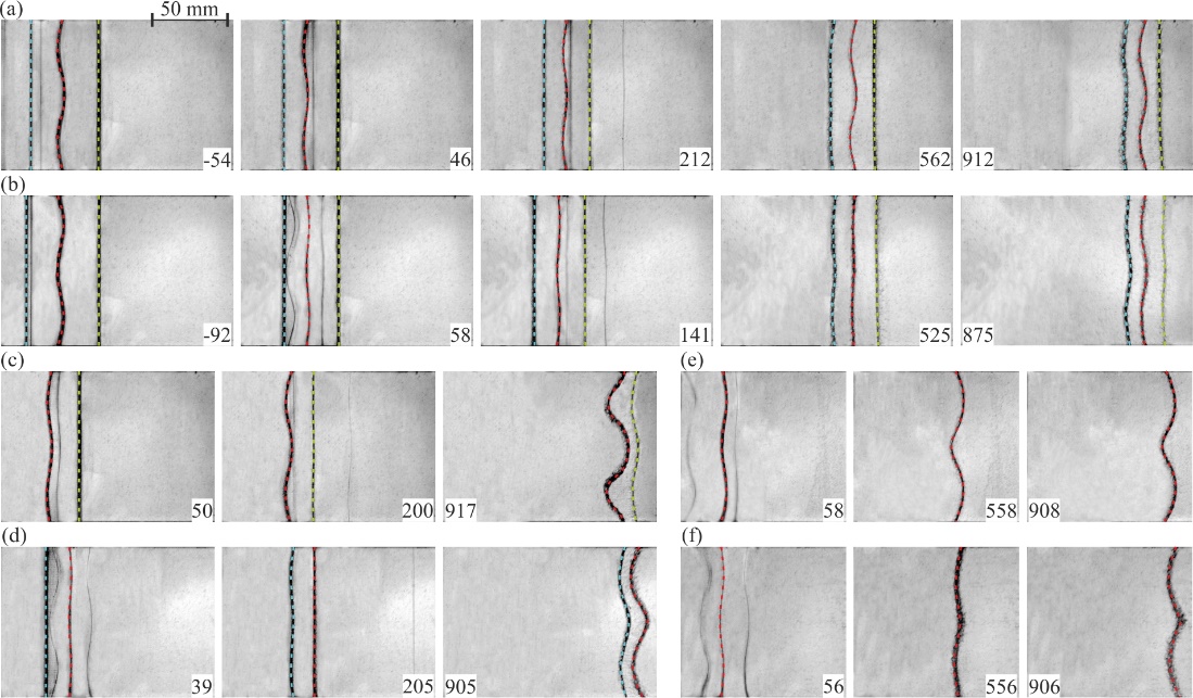 激波管实验是研究RM不稳定性的有效手段,可以提供清晰的界面动态图像和界面演化数据。然而,由于RM不稳定性对界面初始条件极其敏感,因此产生初始条件可控的界面成为关键技术瓶颈。研究人员采用雕刻技术来约束肥皂膜产生了初始形状可控的气体界面,在激波管中实验研究了激波诱导双气层、单气层和单界面演化特征(图1(a)-(f)),基于稳定性分析量化了界面耦合效应,根据气体动力学量化了气层内反射波诱导的额外的流体力学不稳定性。国际学者评价“该工作的实验纹影图片和示意图很好地传达了波动力学的复杂性。实验结果得到了复杂数学模型的支持和验证”。