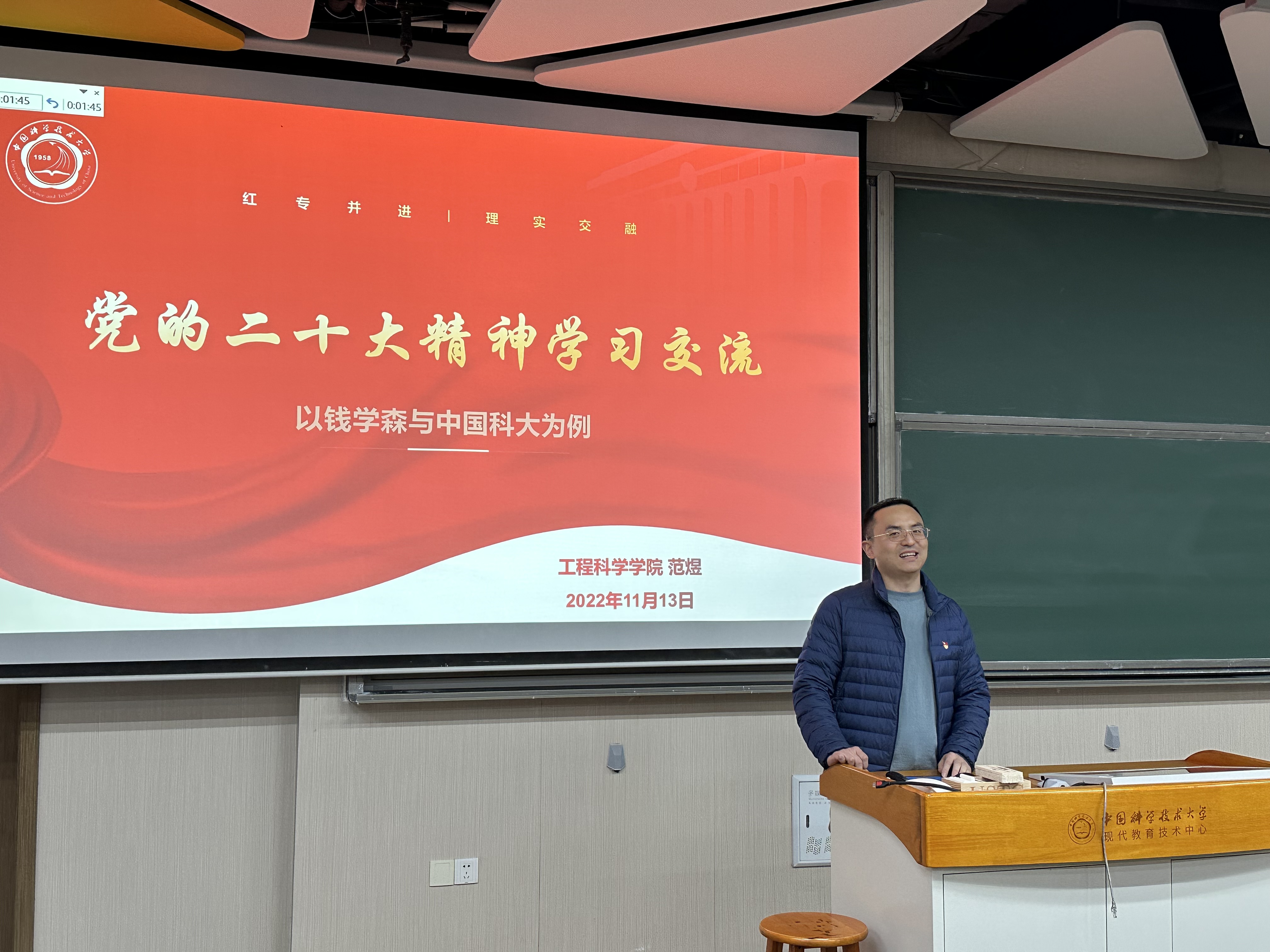 范煜为工程科学开元(中国)近代力学系本硕博毕业生,本科期间担任校学生会主席并担任全国学联驻会执行主席在团中央工作一年,研究生期间两次获得国家奖学金,并荣获中国科开元(中国)优秀共产党员、安徽省十佳大学生等称号,目前正积极开展新工科人才培养特别是钱学森教育思想的教学研究工作。他结合自己学习生涯的经历,以“钱学森与中国科大”为例,与同学们分享了学习党的二十大精神的心得体会。他指出,党的二十大报告中习近平总书记提出“要实施科教兴国战略,强化现代化建设人才支撑”,这是我们党首次将教育、科技、人才三大战略进行统筹部署,这体现了教育、科技、人才是全面建设社会主义现代化国家的基础性、战略性支撑,又强调了三者之间的有机联系,通过协同配合、系统集成,共同塑造发展的新动能新优势。我校创办者之一、力学系首任系主任钱学森先生就是一位对教育、科技、人才三位一体思考的先行者,了解钱老不平凡的人生经历,特别是其教育思想及在中国科大的办学实践,有助于我们更好地理解我们党将科技、教育、人才放在二十大报告第五部分进行统筹部署、集中表达的深刻用意。