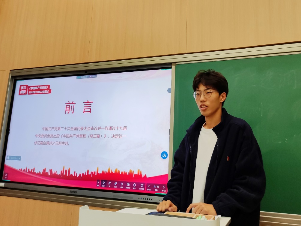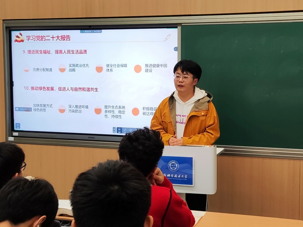 周睿带领大家学习了党的二十大报告,并给同志们布置了后续深入学习的目标和要求。他还提到,习近平总书记2016年考察中国科大时,对同学们提出了殷切希望,同学们应当牢记使命,勇于创新,敢于超越,力争一流,在研究生阶段努力做出原创性的科研成果,踔厉奋发,勇毅前行,为党和国家事业贡献青年的力量。精密机械与精密仪器系党支书金子彤、热科学和能源工程系党支书董奇烜随后分别从党史和党章两个方面带领大家进行了学习,旨在以党史学习作为契机,夯实支部同志理论基础,不忘初心,牢记使命,引导支部同志找准学习与工作的结合点和切入点,矢志奋发作为。