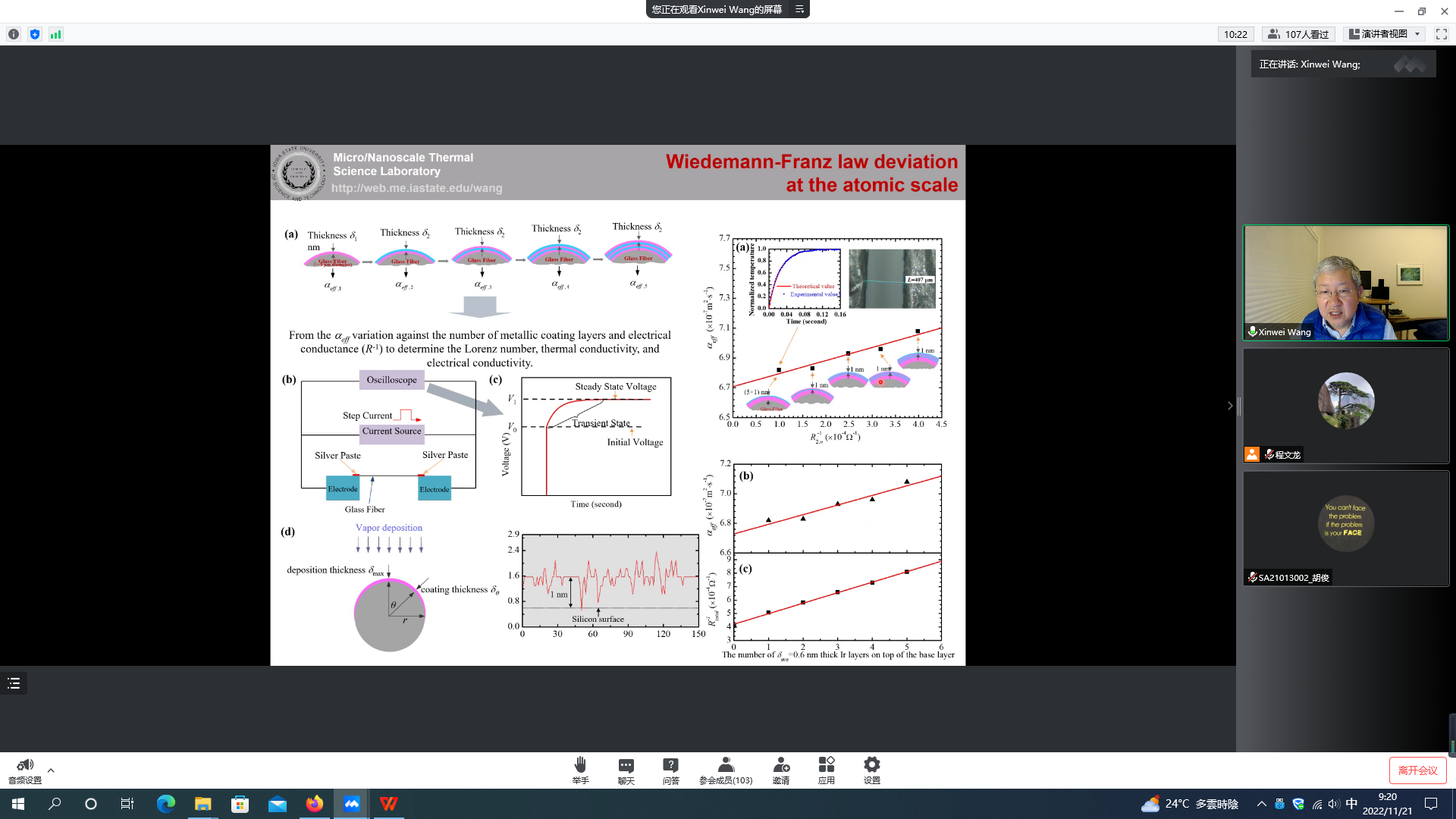 2022年11月21日至23日,爱荷华州立大学王信伟教授做客中国科学技术大学“2022工程科学论坛”为工程科学开元(中国)师生做系列线上学术报告,系列报告主题为“Energy Transport in Extremely Confined Domains”。报告会由热科学和能源工程系程文龙教授主持。