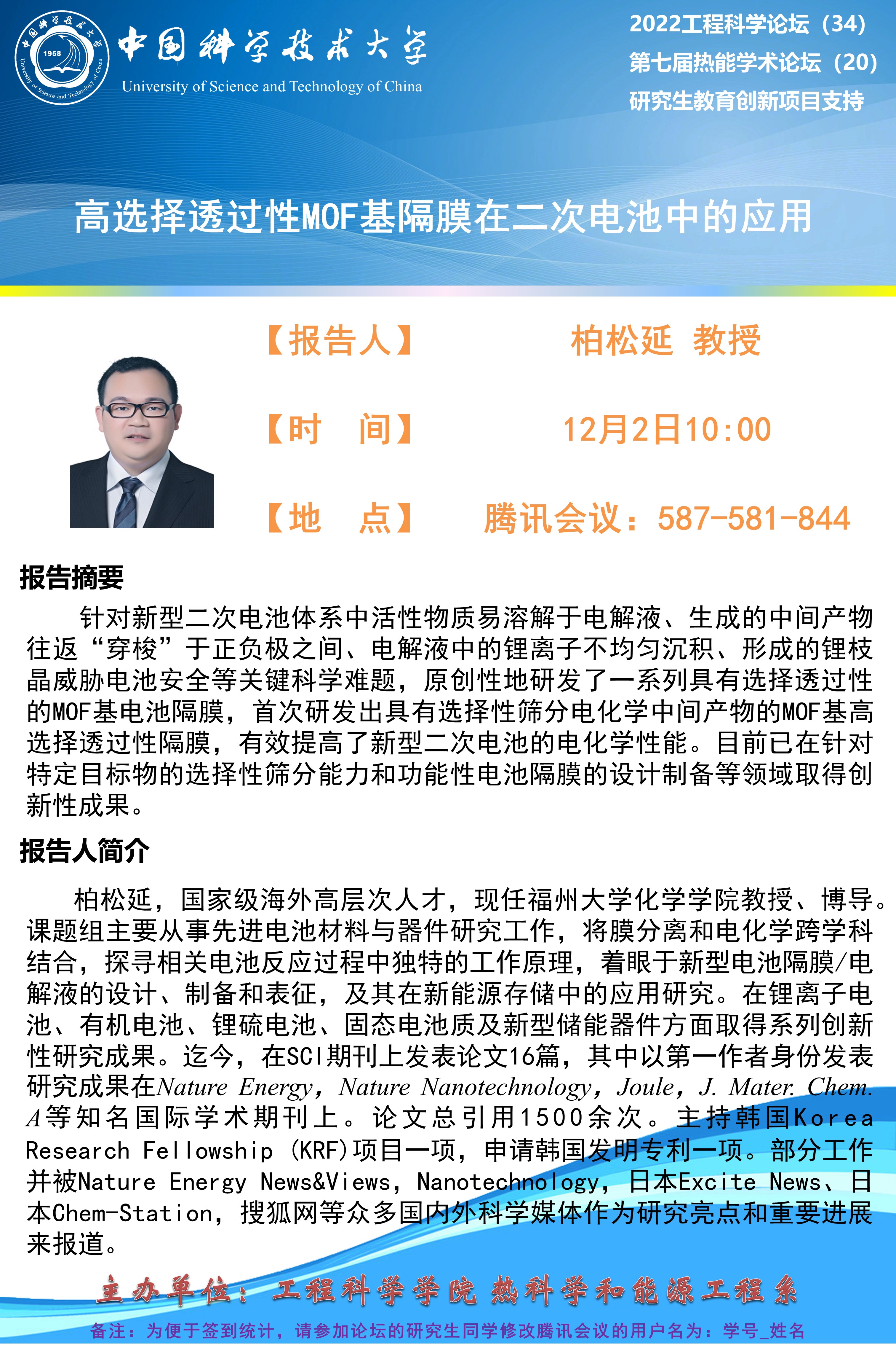 2022工程科学论坛(34)“高选择透过性MOF基隔膜在二次电池中的应用”